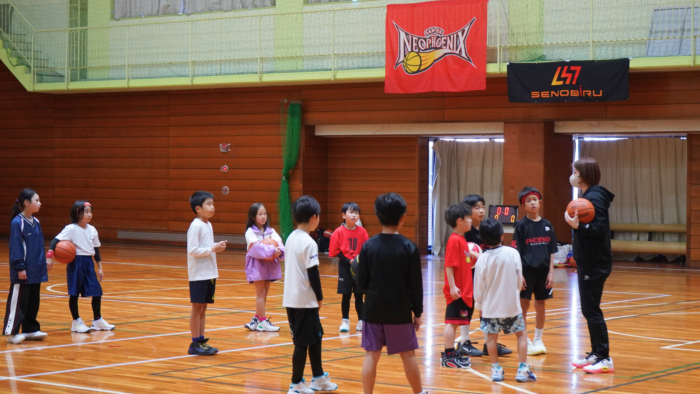 クリニックでは、三遠ネオフェニックスのアカデミーコーチから技術面はもちろん、「ステップアップに大切なこと」など子ども達にお伝えいただき、笑顔溢れる貴重な時間となりました。